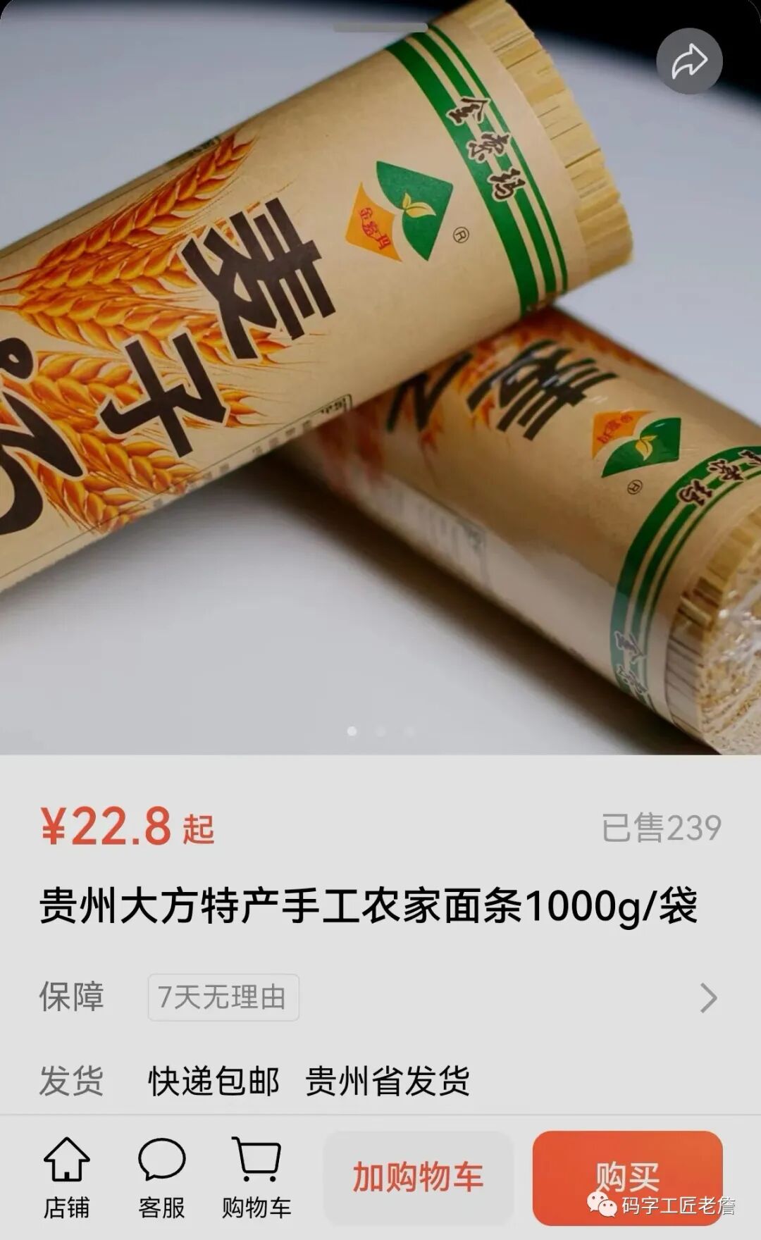 阿龙说,这面条叫手工农家面条,吃起来浓浓的小麦味,又筋道,又顺滑,每袋1000克,22.8元,老詹杨乔一看,好像真不错诶,加之对阿龙夫妇有好印象,于是下单,买了两把,付款45.6元……没几天,面到矣,下到锅里,确实,浓浓的小麦味,
