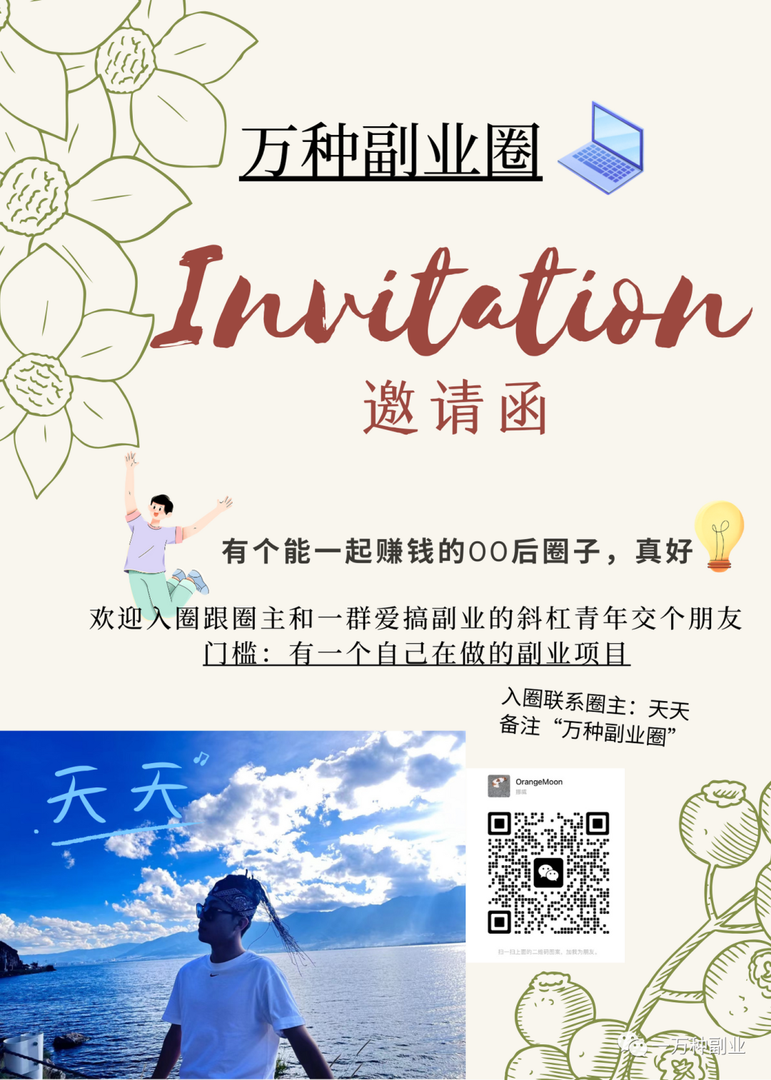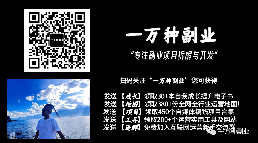 或点击下方名片关注一万种副业 不错过每一天的搞米干货 让学习成为一种习惯。公众号主页有一万种副业项目合集(持续更新中...)