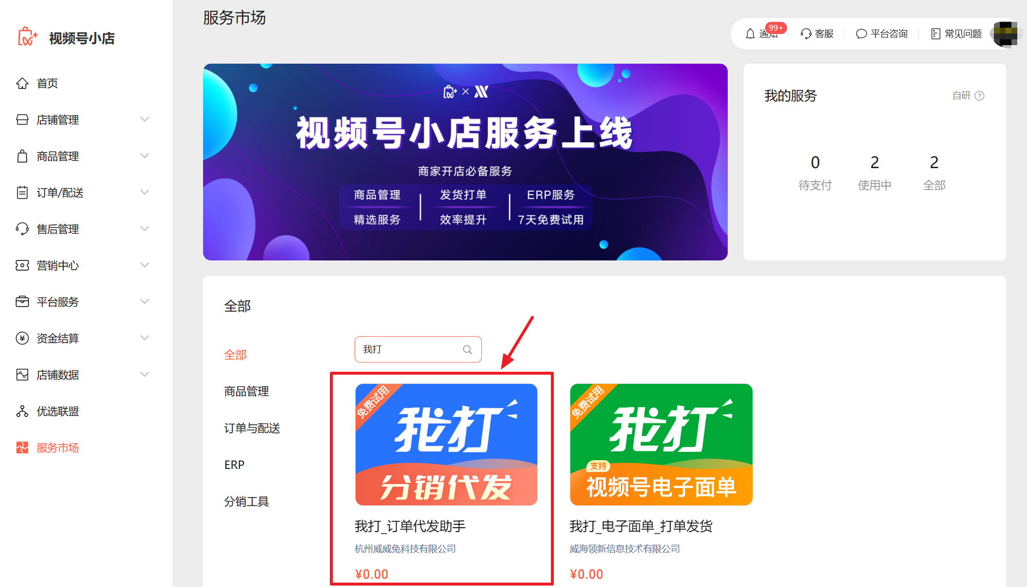 抖音/快手/视频号小店,需在服务市场搜索订购我打_分销代发。