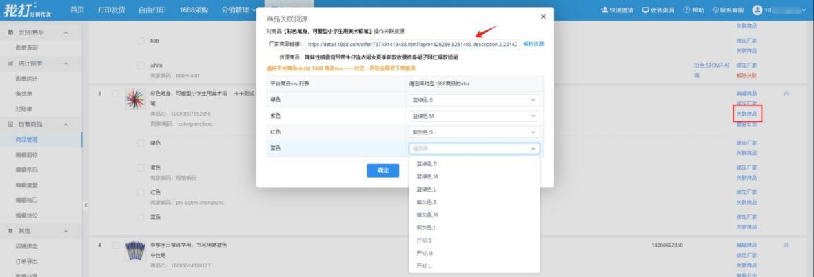然后复制粘贴输入要关联的1688货源产品的链接,并对应1688商品的SKU。
