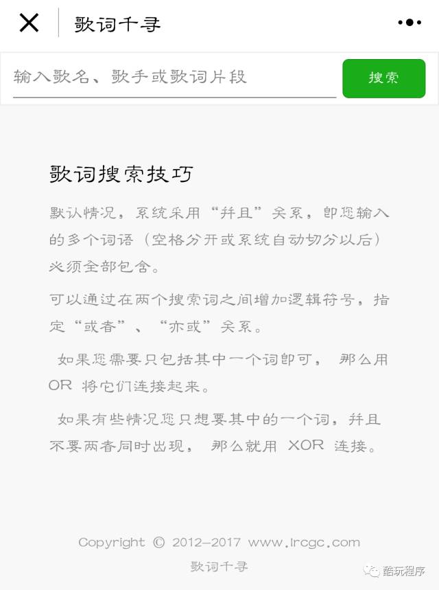 进入小程序【歌词找歌名】,输入歌名、歌手或者歌词片段,即可进行搜索:
