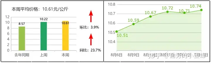 2021年第32周,全国农产品批发市场鸡蛋平均价格为10.61元/公斤,与上周相比,上升了3.9%;与去年同期相比,上升了23.7%;从每日监测数据来看,2021年8月6日~8月13日,鸡蛋平均价格从10.51元/公斤波动至10.74元/公斤,峰值为8月13日的10.74元/公斤,谷值为8月6日的10.51元/公斤。