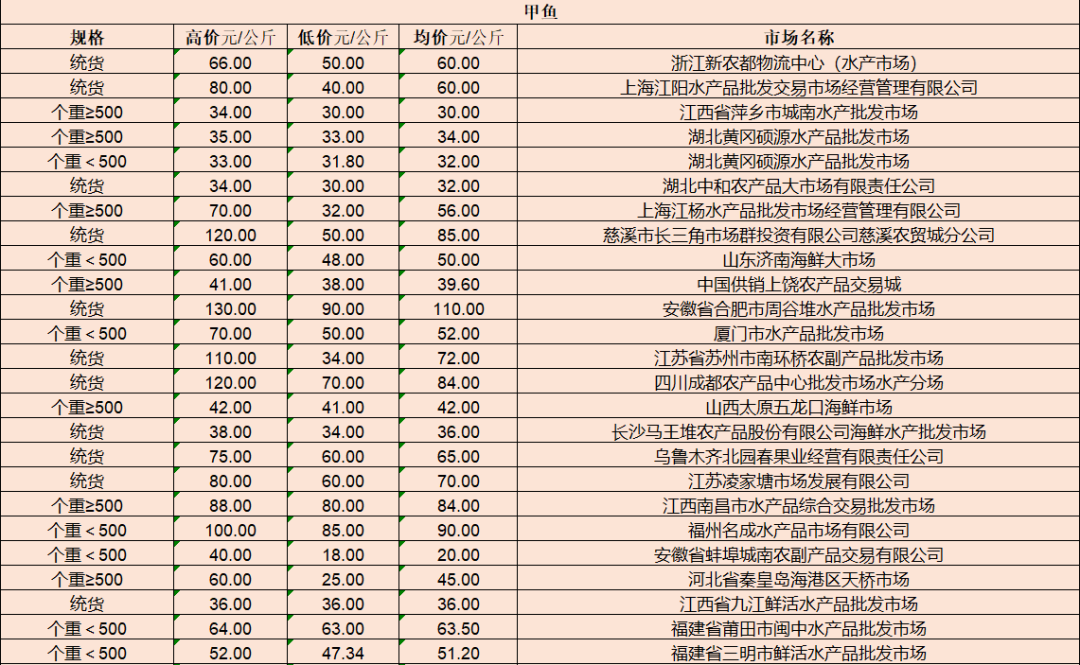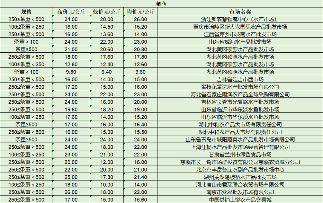 据农业农村部监测,7月20日“农产品批发价格200指数”为118.55,比昨天下降0.12个点,“菜篮子”产品批发价格指数为118.58,比昨天下降0.15个点。截至今日14:00时,全国农产品批发市场鲫鱼18.94元/公斤,比昨天上升0.9%;鲤鱼14.18元/公斤,比昨天上升0.5%;白鲢鱼9.00元/公斤,比昨天上升0.1%;大带鱼37.36元/公斤,比昨天下降3.3%。