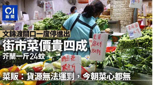 有菜档员工指因为文锦渡关口不准过关,导致货源无法运到街市,他指「来货已经系咁贵」,另一个菜档员工表示「啲货啱啱先到,今朝啲人要菜心都无」。
