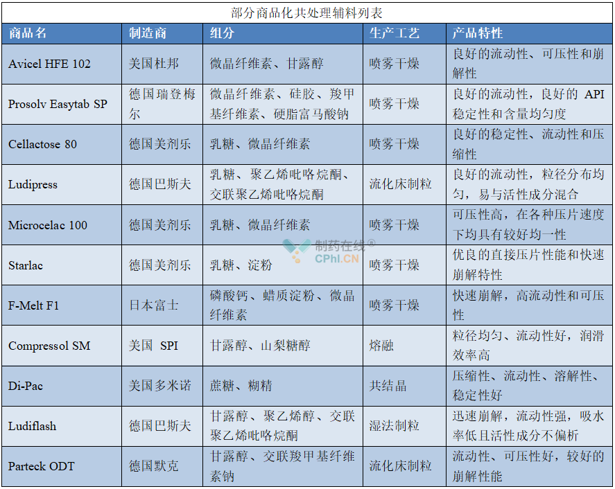 1986年FMC公司申请了第一个微晶纤维素与碳酸钙共处理辅料,共处理辅料的概念被首次提出。此后多家国际著名药用辅料生产公司渐渐把目光转移到混合辅料的研究开发上。目前,多种共处理辅料已被成功开发并应用于药物制剂的生产中,如法国Roquette公司的甘露醇淀粉复合物(Pearlitol Flash),德国Meggle公司的纤维素乳糖80(Cellactose 80),德国BASF公司的乳糖、聚维酮和交聚维酮直压共处理辅料(Ludipress)、德国JRS公司的硅化微晶纤维素(Prosolv)系列和美国FMC公司的微晶纤维素-羧甲纤维素钠(Avicel RC/CL)等。随着国内药物制剂研发水平的提升,对制剂工艺及新型辅料的需求不断提高,近年来国内辅料企业也着力于共处理辅料的研制,如安徽山河药用辅料股份有限公司、珠海东辰制药有限公司、江苏道宁药业有限公司等。
