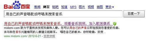 百度搜索【用自己的声音唱歌或哼唱来搜索音乐】。