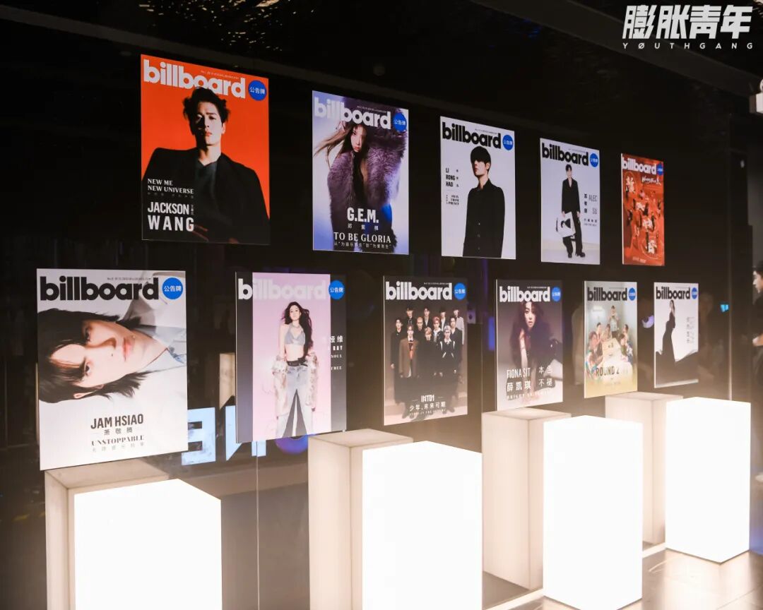 在走廊的另外一侧,摆放着 Billboard 公告牌的过往封面,一眼便能看到我们熟悉的中国优质音乐人,也暗藏着中国音乐市场的发展变迁。